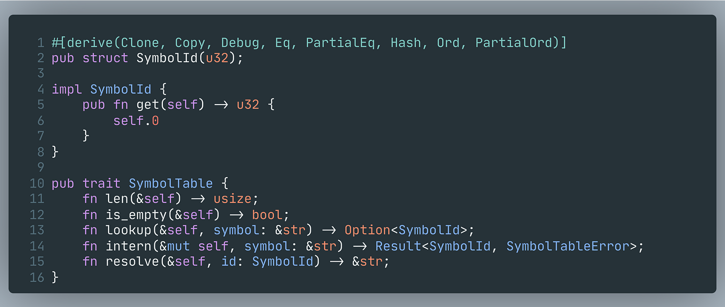 In Chronoxide, SymbolId is a dense u32, and SymbolTable is a trait: