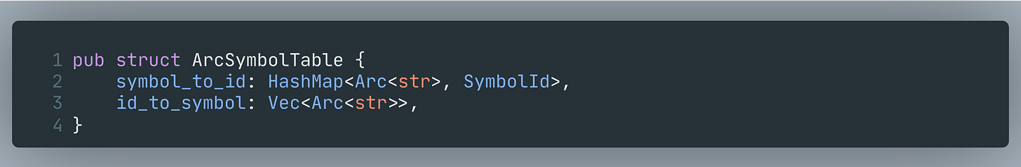 intern()allocates a newArc<str>(heap allocation + copy), pushes it intoid_to_symbol, and inserts it intosymbol_to_id.On a hit, it returns the previously assigned ID.