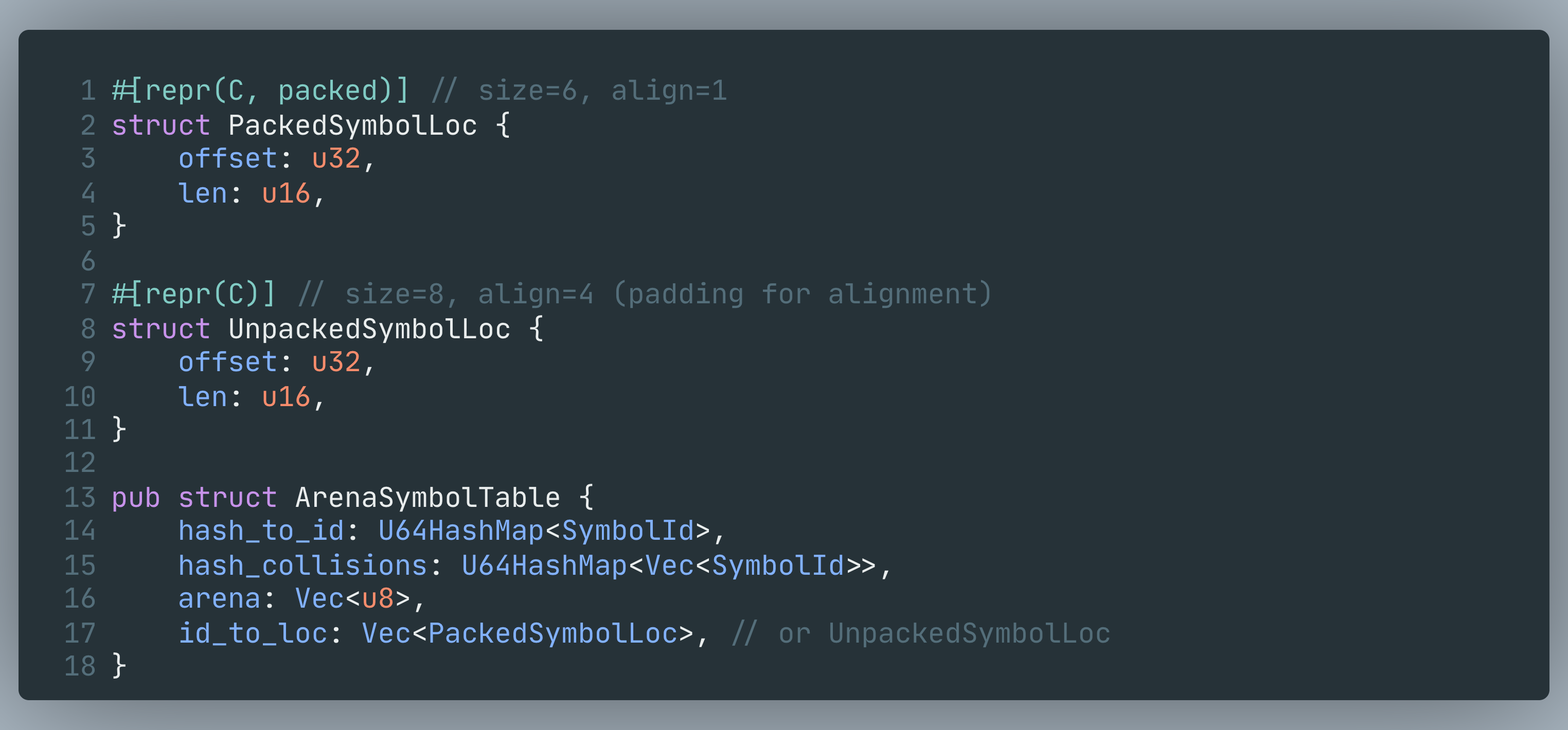 ArenaSymbolTable stores all string bytes in a single growing Vec<u8> (”arena”), and stores a compact location per symbol: