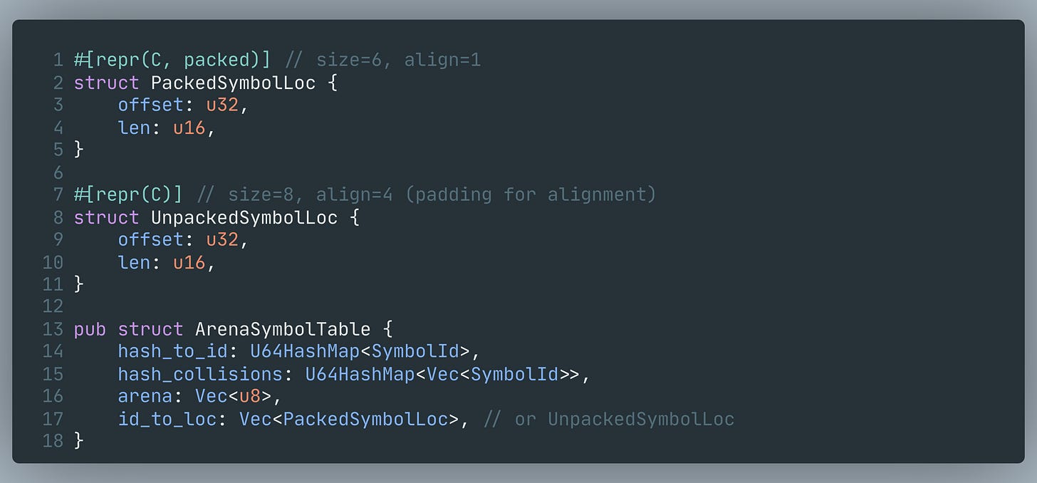 (offset,len)metadata reduces per-symbol overhead, but it also means unaligned loads; the unpacked variant trades ~2 bytes/symbol for better alignment.Memory is monotonic (like most interners): you can’t delete individual symbols without rebuilding.